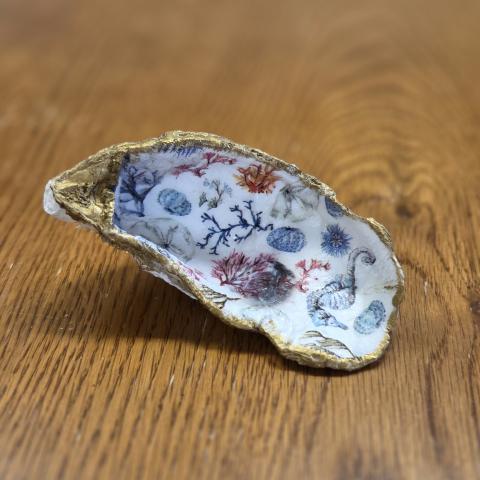Decorate shells with nautical-themed paper napkins and Mod Podge! All materials will be provided, but feel free to bring your own shells to decorate.